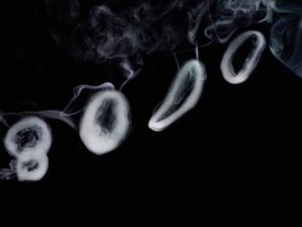 Fred kan geen kringetjes blazen. Fred blaast en kucht een grijze wolk uit.